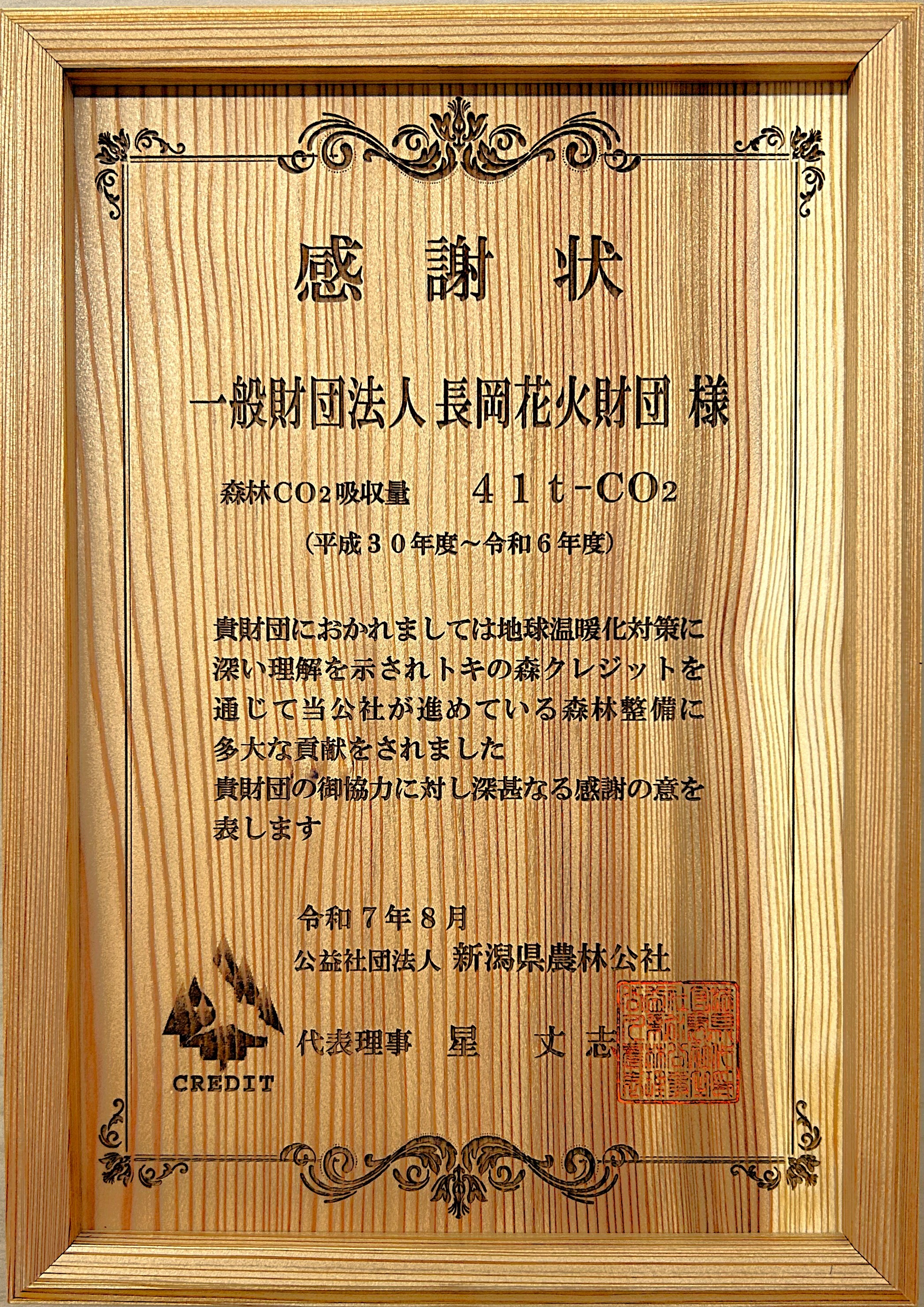 令和7年9月30日、「公益社団法人新潟県農林公社カーボン・オフセットクレジット販売に係る感謝状贈呈の取扱要領」に則り、一般財団法人長岡花火財団様へ感謝状を贈呈し、トキの森クレジットの収益を活用した森林整備の実施報告をしました。一般財団法人長岡花火財団様からはこれまでイベント開催のオフセットでトキの森クレジットをご購入いただき、トキの森プロジェクトを支援してくださいました。